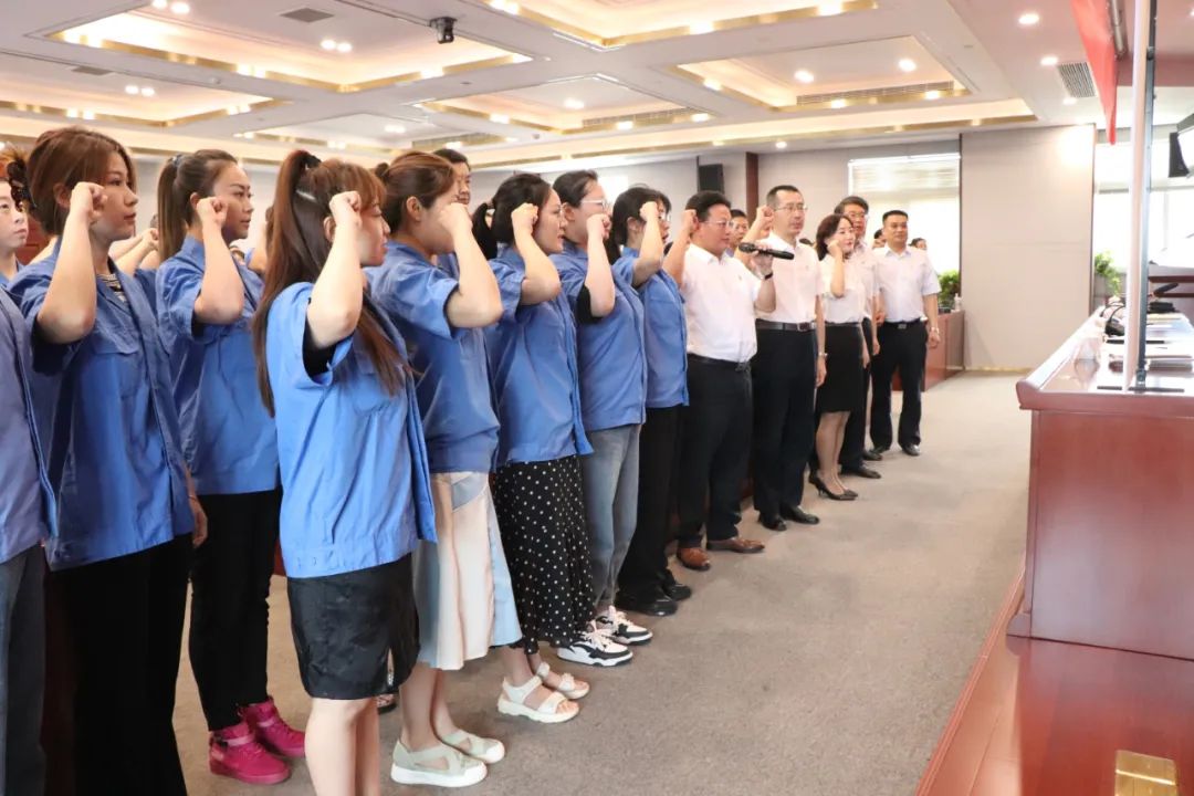 誓言錚錚,薪火相傳。會議現場新入黨的黨員整齊列隊與全場黨員一同高舉右臂、緊握右拳,重溫入黨誓詞,共同感悟中國共產黨人的初心和使命,強化為國鑄器的責任和擔當,表達為黨的事業奮斗終身的愿望和決心。
