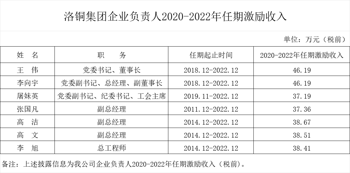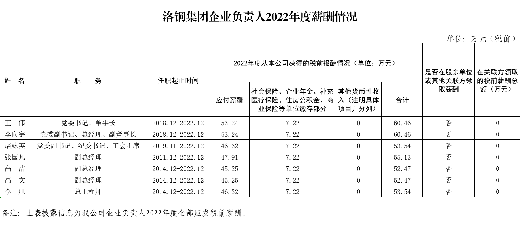 洛銅集團企業負責人2022年度薪酬情況及2020-2022年任期激勵收入信息披露