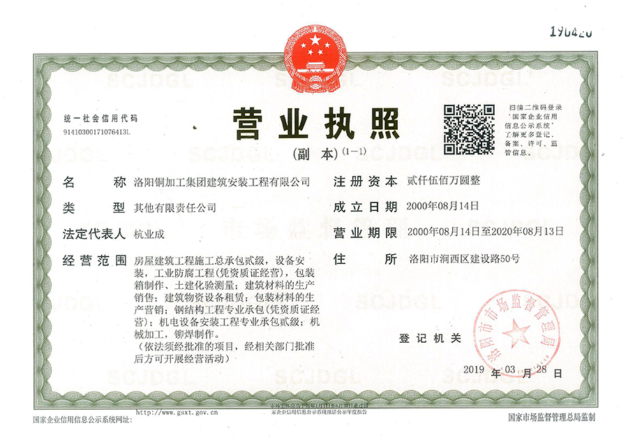 洛陽銅加工集團建筑安裝工程有限公司是洛陽銅加工集團有限責任公司下屬獨立法人單位。公司最早前身是洛陽銅加工廠第九分廠,成立于一九五六年三月,后改制為一家集工業與民用建筑、設備安裝、工業防腐、建筑材料生產銷售、建筑物資設備租賃為一體的綜合性企業?,F有建筑工程施工總承包貳級資質;冶金工程施工總承包叁級資質;建筑機電安裝工程專業、防水防腐保溫工程專業承包貳級資質;鋼結構工程專業承包叁級資質。